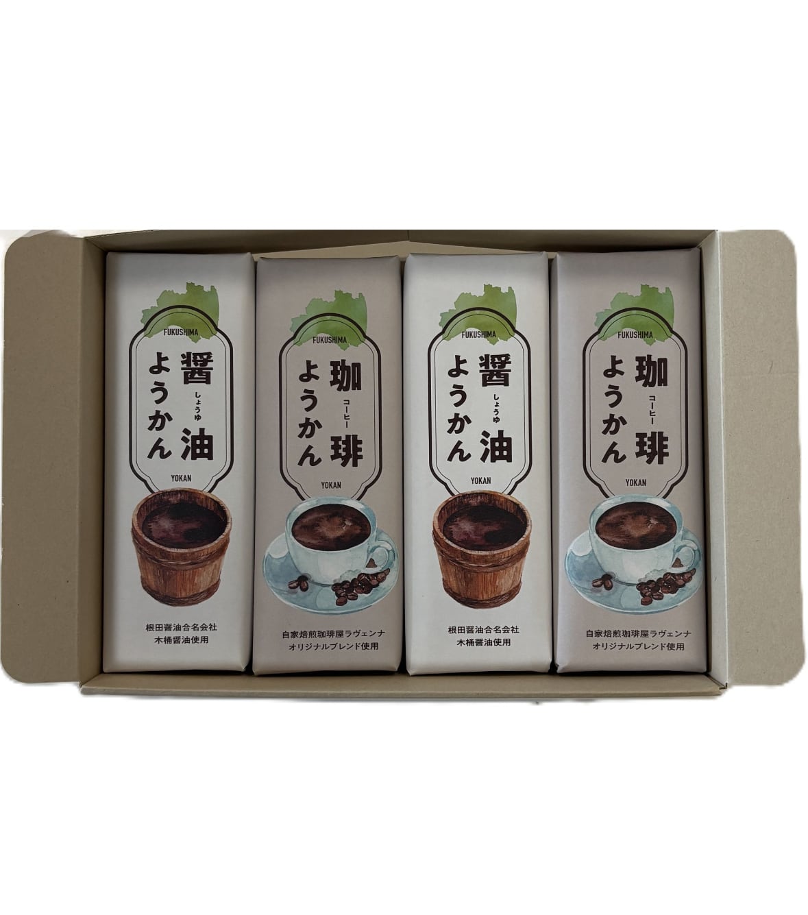 日本の伝統的な和菓子である羊羹に、福島県白河市の根田醤油製「木桶醤油」を加え、甘辛いみたらし味に仕上げました。シンプルな原材料で作られた珍しい味の羊羹を是非お楽しみください。